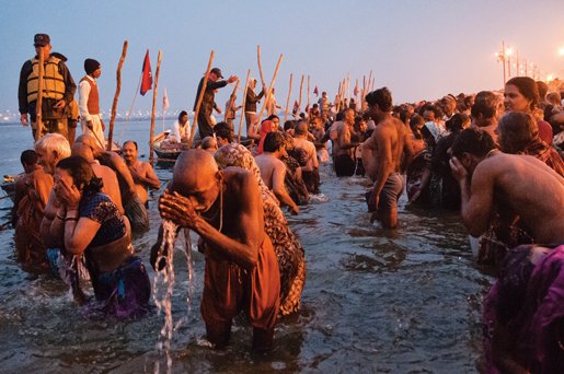 Sanjeev is also there that night, resisting the bitter cold while accompanying his old grandfather, with whom he is immersed in the Ganges. Thousands of other people are making their ritual ablutions at the same time, under the watchful and concerned eye of hundreds of police and military officers.
